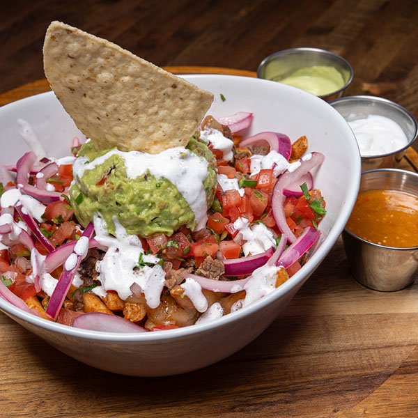 Fries and Carne Asada with Queso, pico de gallo, crema and guacamole.