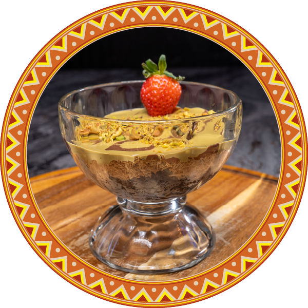 A rich, fudgy chocolate brownie infused with Middle Eastern flair, topped with a drizzle of date syrup, crushed pistachios, and a touch of gold dust.