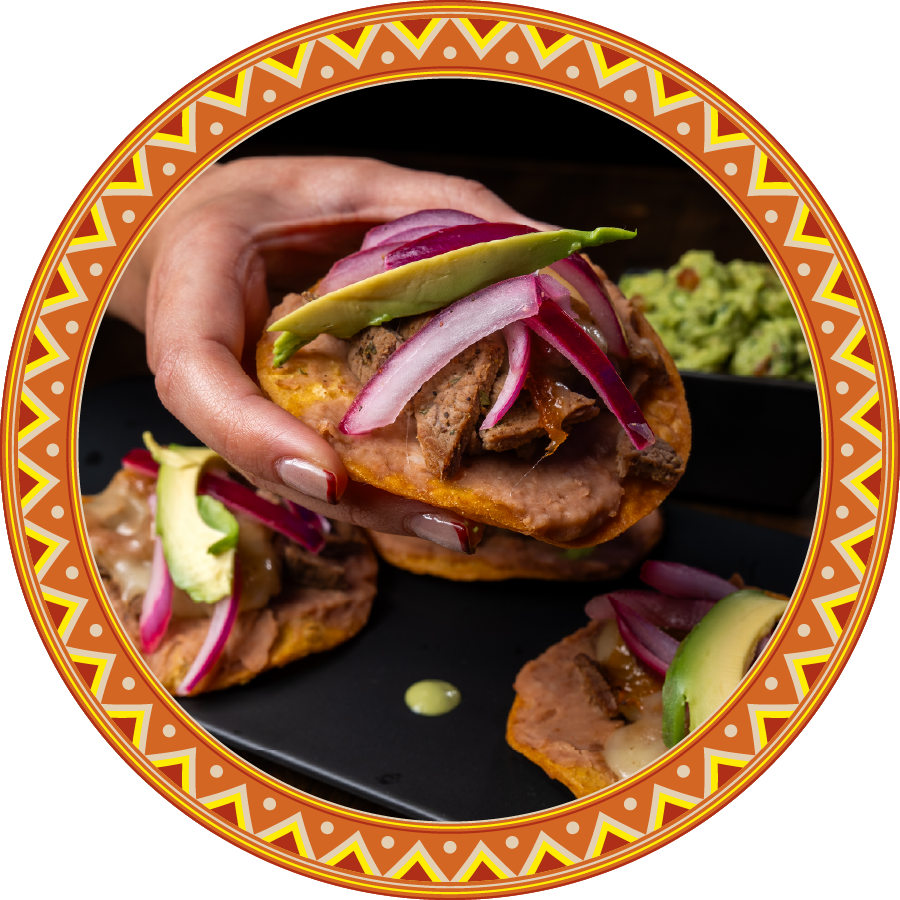 Four tostadas with Refried Beans, the Meat of your choice or Nopalitos, Topping with Melted Cheese, Pickled Red Onions and Slice of Avocado.